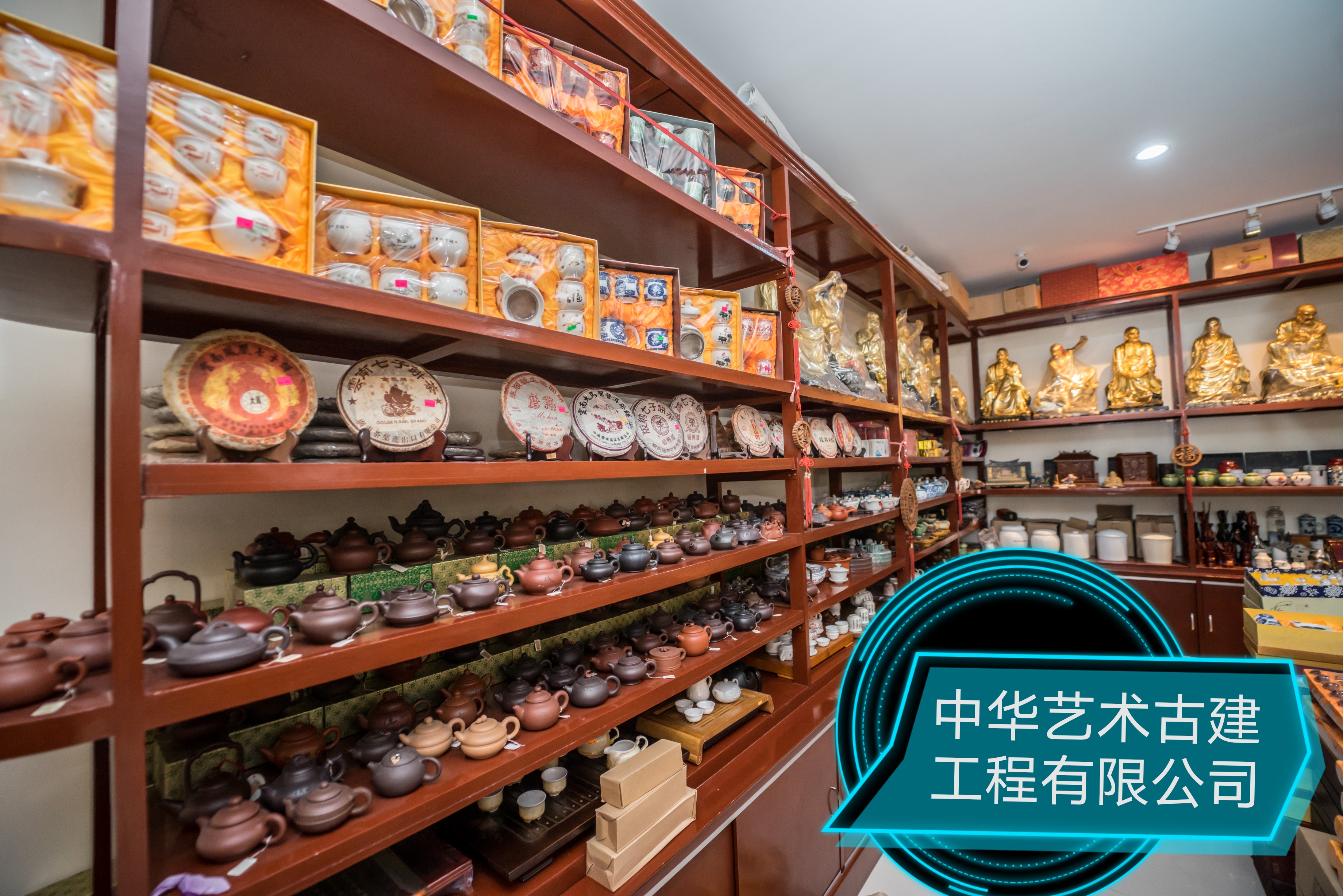 专柜设有各式品种茶叶,精美的茶具。